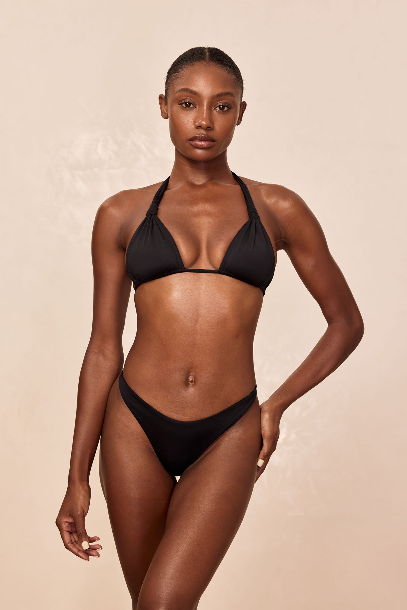 Halter plunge, Contrast binding, Low back, High leg, Cheeky coverage