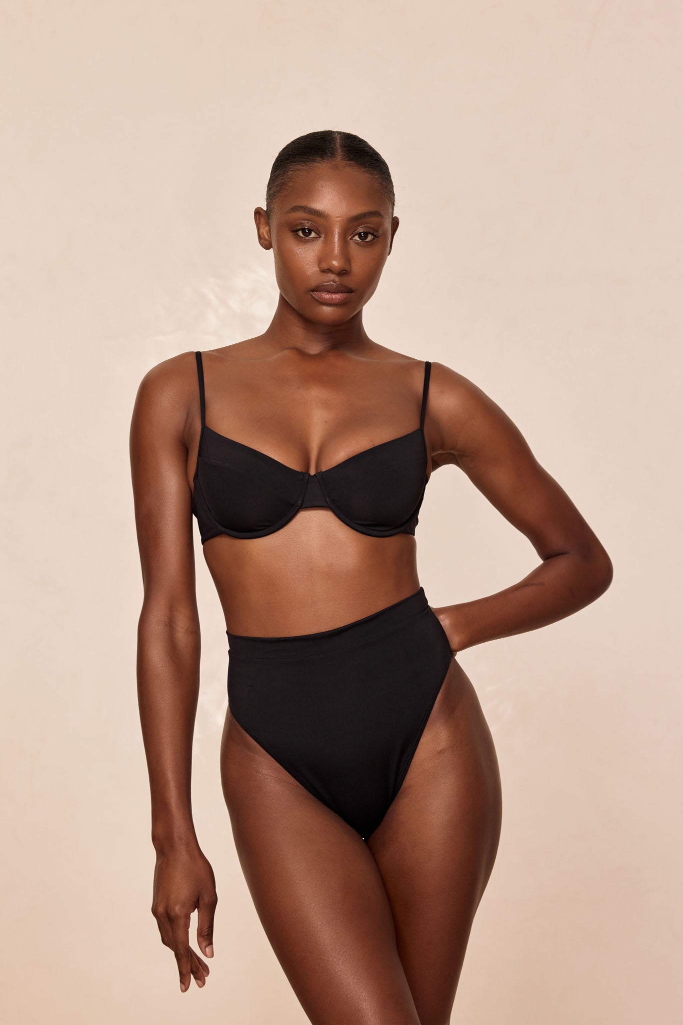 Underwire cups, open back detail w/ back tie closure, adjustable shoulder straps, high leg, cheeky coverage